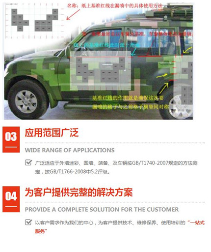 多年經驗偽裝波段范圍:可見光(380nm~760nm)和近紅外(760nm~1200nm); 外墻迷彩漆不是水漆。盡管水漆是一種環(huán)保型的涂料,;